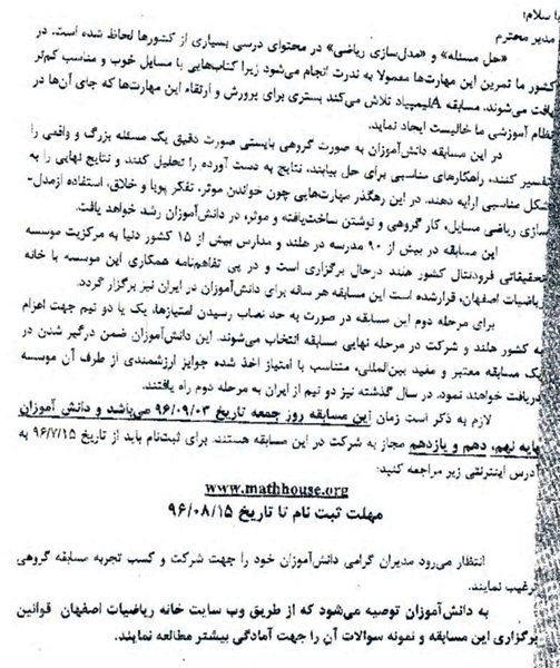 دانش آموزان علاقمند به شرکت در Aلمپیاد ریاضی، می توانند حداکثر تا 15 آبان 96، با مراجعه به سایت خانه ریاضیات اصفهان به آدرس