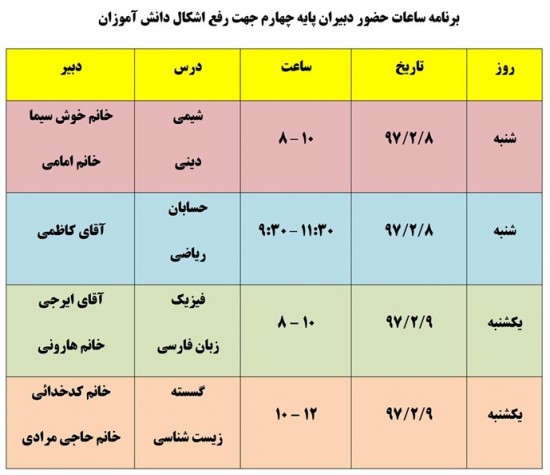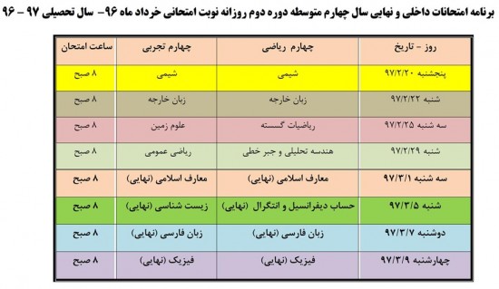 برنامه کلاس های رفع اشکال و امتحانات پایانی پایه چهارم- خرداد 97