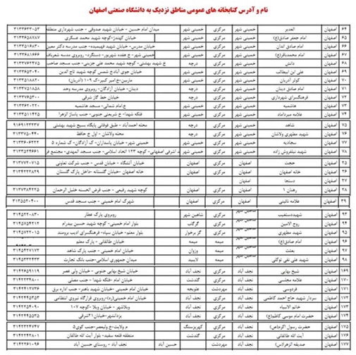 نام و آدرس کتابخانه های عمومی در محدوده دانشگاه صنعتی را در ادامه ببینید.