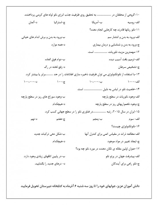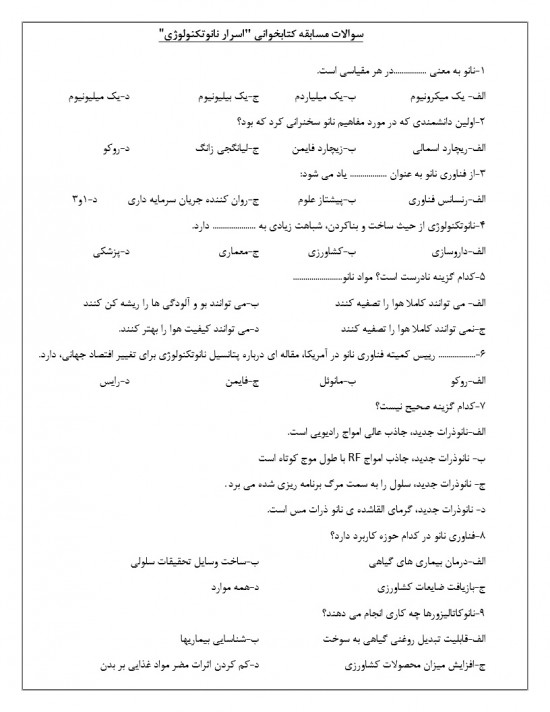 سوالات مسابقه کتابخوانی اسرار نانوتکنولوزی را در ادامه ببینید و پاسخ خود را تا سه شنبه 6 آذر به کتابخانه تحویل نمایید.