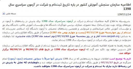به اطلاعیه سازمان سنجش در مورد ثبت نام آزمون سراسری 98 توجه فرمایید: