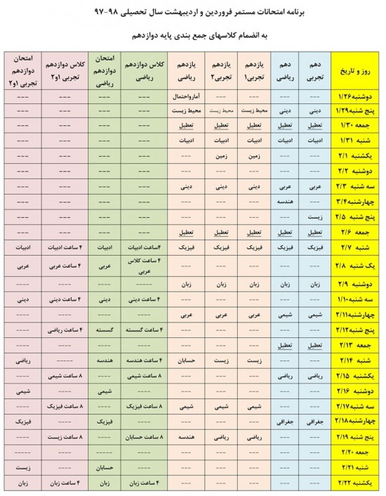 برنامه امتحانات مستمر+کلاسهای جمع بندی پایه 12