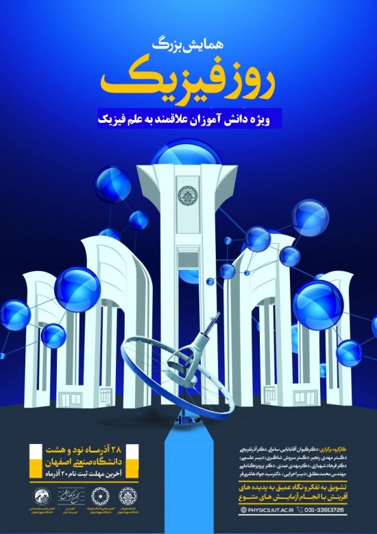 پنجشنبه 28 آذرماه، به روال سنوات گذشته، دانشکده فیزیک دانشگاه صنعتی اصفهان همایش بزرگ روز فیزیک برای دانش آموزان علاقمند به این علم را برگزار می نماید.