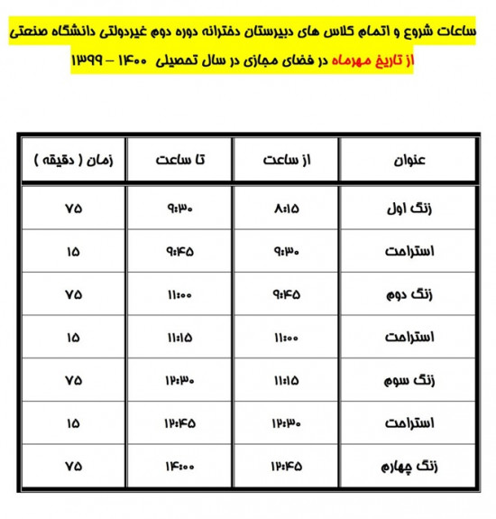 در ادامه مطلب، زمان بندی کلاسها در دو روش حضوری و مجازی را ملاحظه نمایید.