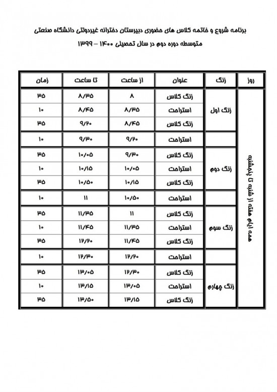 برنامه زمان بندی کلاسهای حضوری و مجازی- سال تحصیلی 1400-1399