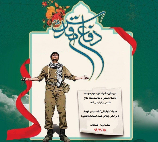 دبیرستان دخترانه دوره دوم متوسطه دانشگاه صنعتی به مناسبت هفته دفاع مقدس برگزار میکند: مسابقه کتابخوانی کتاب مهاجر کوچک (بر اساس زندگی شهید اسماعیل دقایقی) دانش آموزان عزیز نسخه الکترونیکی کتاب را در فایلهای ضمیمه ببینید.