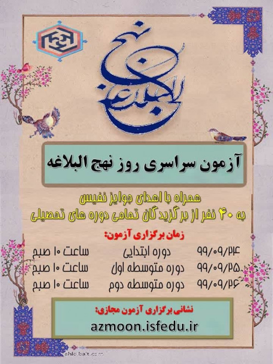 2. تمامی مراحل اجرا و اعلام نفرات برتر به عهده اداره کل بوده و هدف از اینآزمون آشنائی هرچه بیشتر دانش آموزان عزیز با کتاب انسان ساز نهج البلاغه مورد تأکید است.