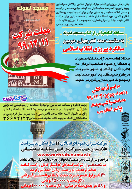 مهلت شرکت در مسابقه تا 99/12/11 از طریق سامانه: mehrab.namaz.ir می باشد .