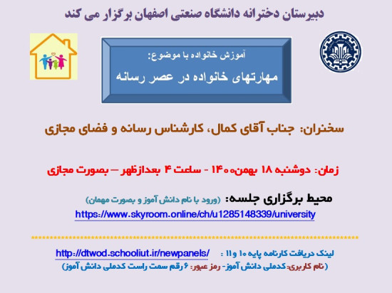 دوشنبه 18بهمن، ساعت 4بعدازظهر، جلسه آموزش خانواده بصورت مجازی با حضور جناب آقای کمال، کارشناس سواد رسانه و با استقبال خوب اولیای گرامی، برگزار گردید. همچنین کارنامه امتحانات دی ماه دانش آموزان در سایت همکلاسی ارائه شد.