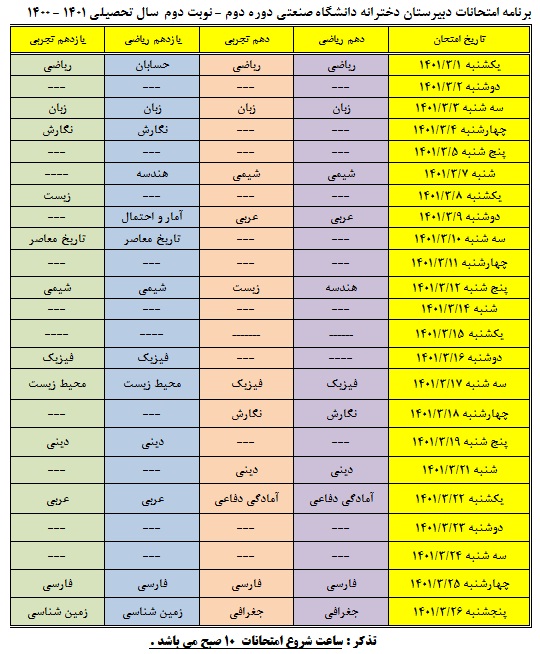اصلاحیه برنامه امتحانات پایانی خرداد 1401- پایه 10 و 11