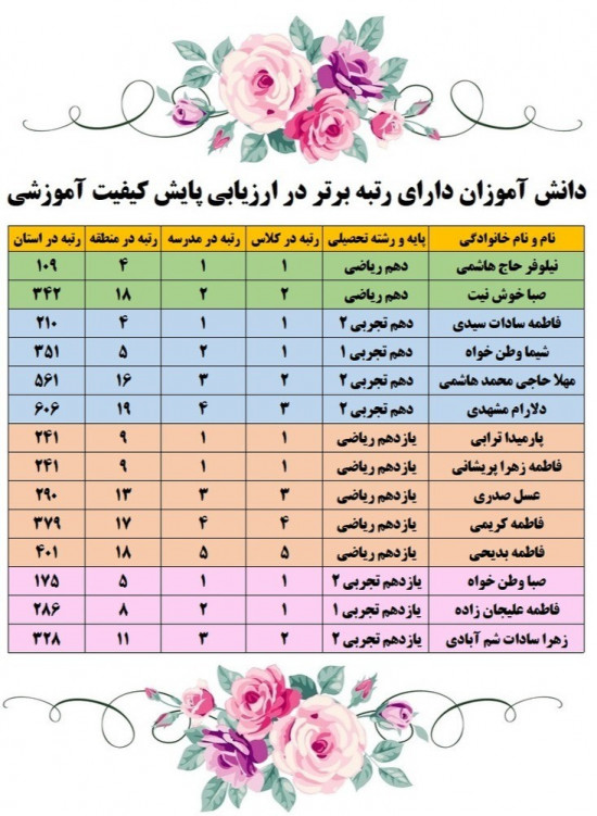 رتبه های برتر منطقه ای در آزمون پیشرفت تحصیلی- اسفند 1401