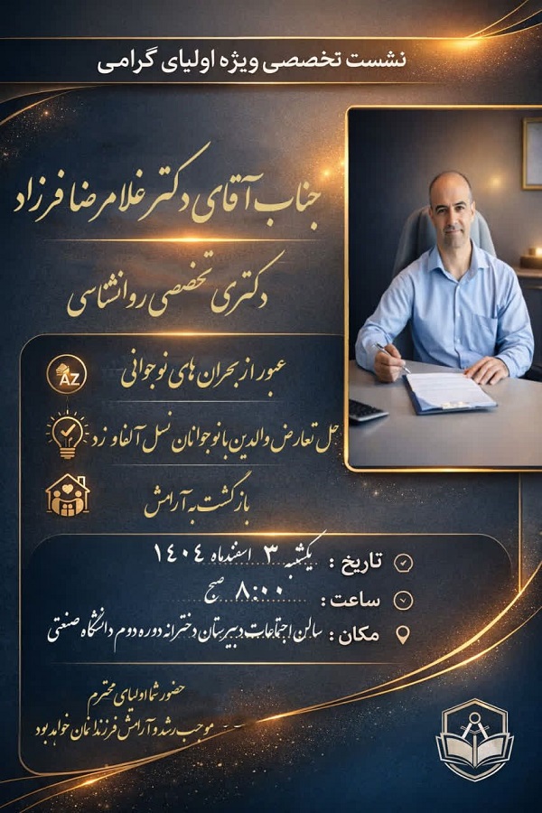 به منظور همراهی مؤثرتر خانواده و مدرسه در مسیر رشد و موفقیت فرزندانمان، جلسه‌ای تخصصی در قالب آموزش خانواده و با سخنرانی جناب آقای دکتر فرزاد برگزار میگردد