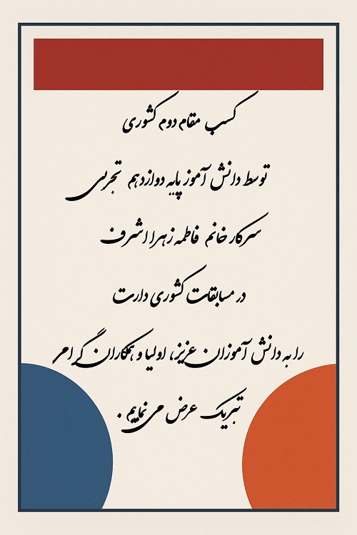 کسب مقام دوم کشوری توسط دانش آموز پایه دوازدهم تجربی سرکار خانم فاطمه زهرا اشرف در مسابقات کشوری دارت